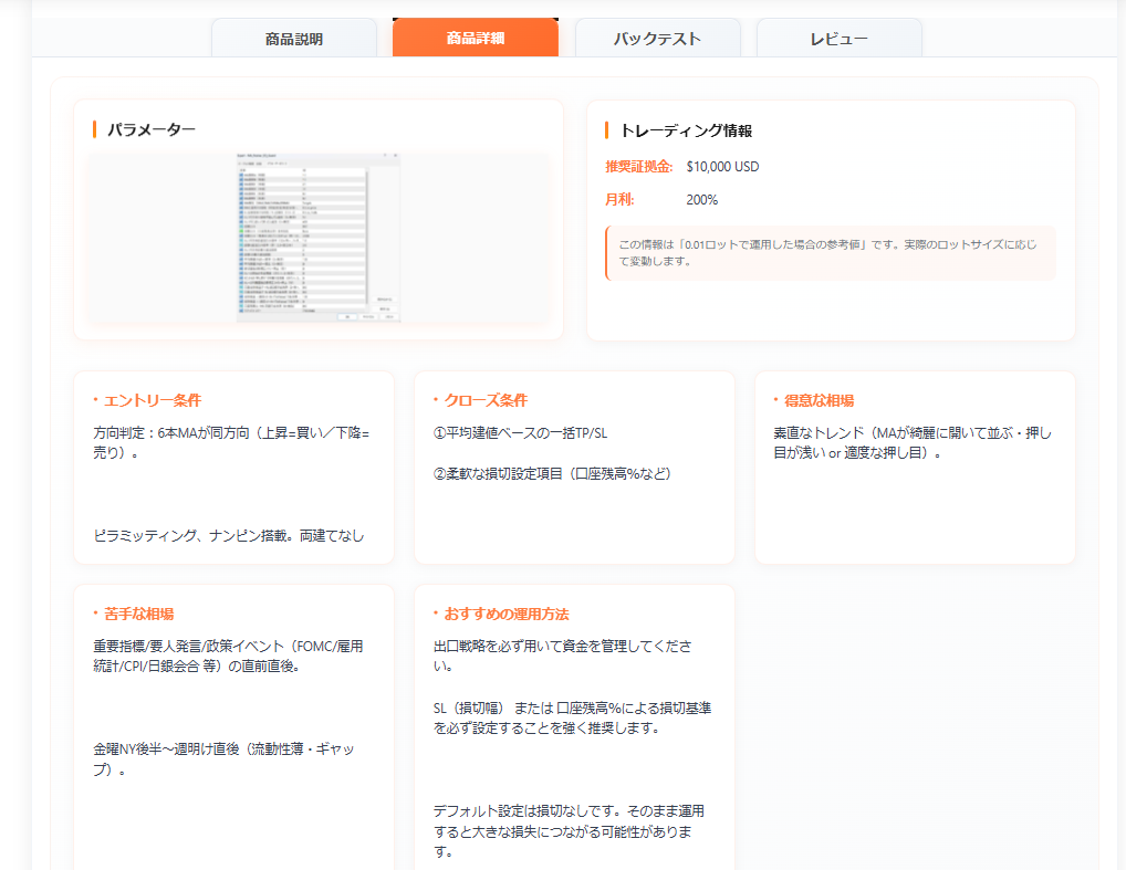 会員登録後、ログイン状態で各EAの詳細ページを閲覧できるようになります。