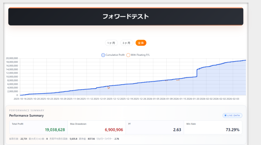 総損益1,900万円越・RF2.76・PF2.63・勝率73%・月利73%と、数値だけ見るとかなり好成績ですね。運用開始が2025/10月中旬のため、公表されている総損益、初期証拠金だけで判断すると平均月利は300%近くとなっています!