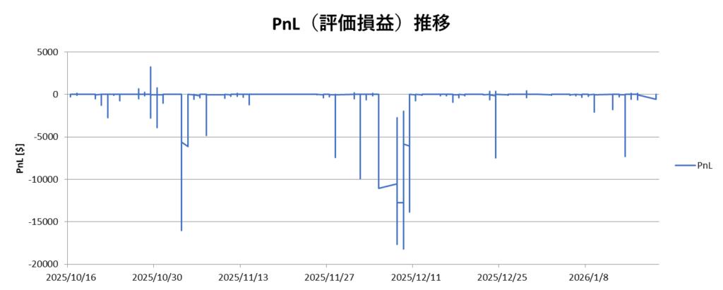 複数回の数万USD相当の含み損が発生していました。また、最大DDは24,000USDほどとなっており、推奨初期証拠金を遥かに超える含み損を抱えていました。上記のグラフはエクイティを1分毎に計算し、15分毎に出力させた結果ですが、2025年10月末、12月上旬ごろに大きめの含み損を抱えています。