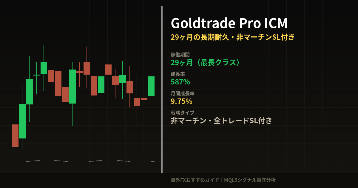Goldtrade Pro ICMは、MQL5のゴールド系シグナルを「6か月以上の実績・XAUUSD中心・エクイティDD30%以下」という条件で絞り込んだ結果に残った、精鋭候補のひとつです。